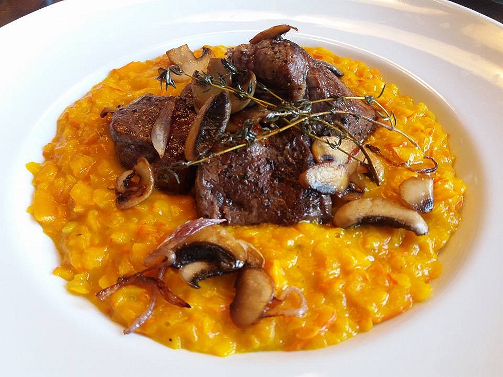 Anschließend das Rinderfilet in kleinen Stücke schneiden und in dem Olivenöl mit der geschnittenen Zwiebel und den Rosmarinzweig braten. Zum Schluß die geschnittenen Champignons hinzufügen, ggf. nachwürzen und mit dem Püree anrichten.