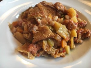 Das Brot in Olivenöl goldbraun und knusprig braten, auf Küchenpapier abtropfen lassen. In eine ofenfeste Form oder mehrere kleine ofenfeste Formen nacheinander die Hälfte von Brot, Bohnenpüree und Gemüse-Wurst- Mischung schichten. Vorgang wiederholen. Mit frisch geriebenem Parmesankäse bestreuen und auf der mittleren Schiene circa zehn Minuten goldbraun überbacken. Zum Schluß mit Olivenöl beträufeln.