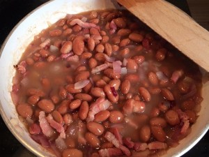 Den Speck anbraten, die Zwiebeln im Speckfett mit anbraten, Alles mit Prosecco ablöschen. Die Bohnen hinzugeben, mit Salz und Pfeffer abschmecken und ca. 1/2 Stunde auf der Flamme köcheln lassen.