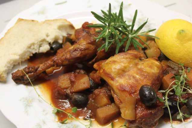 Die Kaninchenkeulen, die kleingeschnittenen Tomaten und die schwarzen Oliven hinzufügen. Bei 200 Grad im Ofen 1 Stunde schmoren lassen. Nach 30 Minuten die Zucchinistückchen hinzufügen. Mit Salz, Pfeffer und Zitronensaft abschmecken.