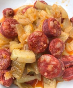 Die Fenchelknollen kleinschneiden und mit wenig Olivenöl in einer Pfanne andünsten. Die Chorizowürstchen in Scheiben schneiden und mit in die Pfanne geben. Auf kleiner Flamme 15 Minuten mit geschlossenem Deckel dünsten.