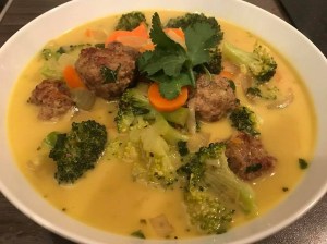 In der Zeit aus dem Hackfleisch, der zweiten gewürfelten Zwiebel und dem Ingwer (fein gerieben) Mettbällchen formen und in Öl 10 Minuten anbraten. Diese dann der Suppe hinzufügen.