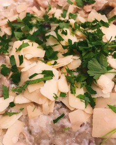 Die Zwiebel und den Knoblauch in Öl anschwitzen. Das Hähnchenfilet anbraten und die Pilze dazugeben. Mit der Gemüsebrühe auffüllen. Wenn die Pilze gar geköchelt sind, den Reis hinzugeben und rühren bis das Risotto gar ist. Anschließend mit Parmesan und Petersilie garnieren.