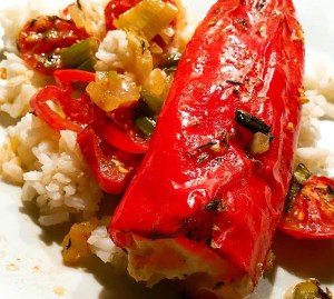 Die Paprika entkernen, mit dem klein geschnittenen Käse füllen und in eine gefettete Backform legen.