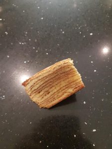 Den Backofen auf 1. Stufe Grill einstellen. Den Boden einer Springform mit Backpapier auslegen und ca. 3 EL Teig darauf verstreichen. Im vorgeheizten Backofen auf unterster Schiene ca. 3 Minuten goldbraun grillen. Dann wieder ca. 3 EL Teig darauf streichen und wieder ca. 3 Minuten grillen. Mit dem restlichen Teig weiter so verfahren. Den Kuchen dabei immer im Auge behalten, damit er nicht plötzlich zu dunkel ist.