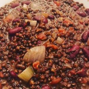 Die Zwiebeln und den Knoblauch schälen, würfeln und im Rapsöl anbraten. Die Linsen und die Bohnen dazugeben und mit Wasser auffüllen. Die Gewürze und den Ingwer hinzufügen, Die Tomaten dazugeben. Alles 1 Sunde köcheln lassen. Anschließend die Butter und die Sahne hinzufügen und mit Chili, Salz und Pfeffer abschmecken.