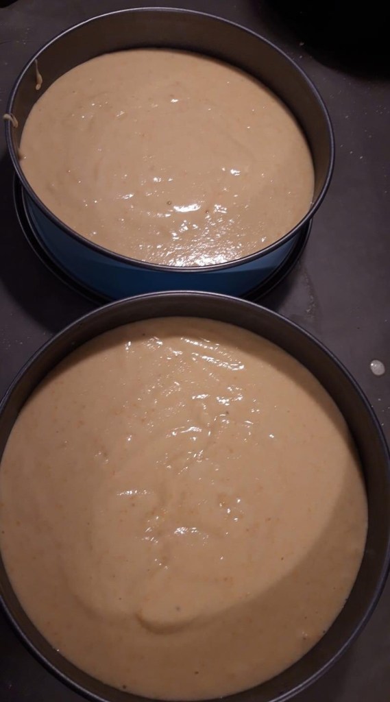 6 Eier mit dem Puderzucker schaumig rühren und dann die Mandeln und das Backpulver hinzufügen und miteinander verquirlen. Nun wird das Orangenpüree mit untergerührt.
