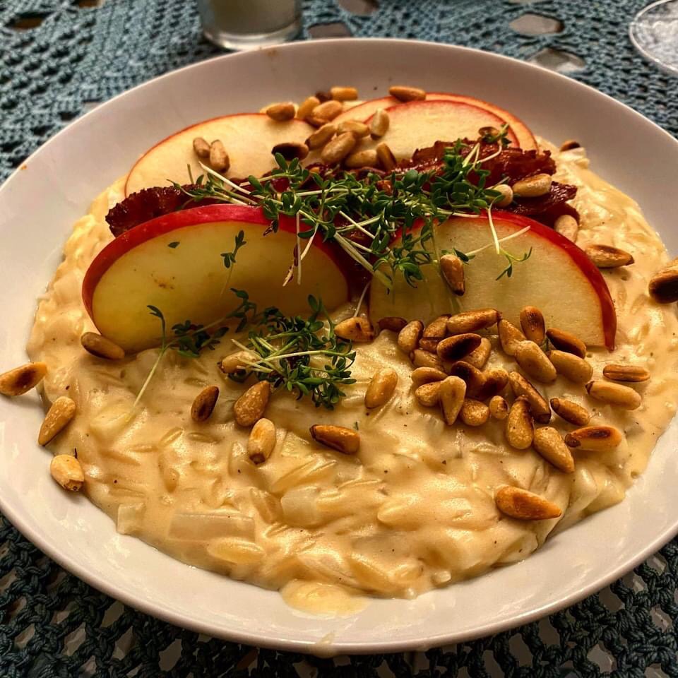 Auf Tellern anrichten, Speck, Apfelscheiben, Pinienkerne und Kresse hinzugeben und servieren.