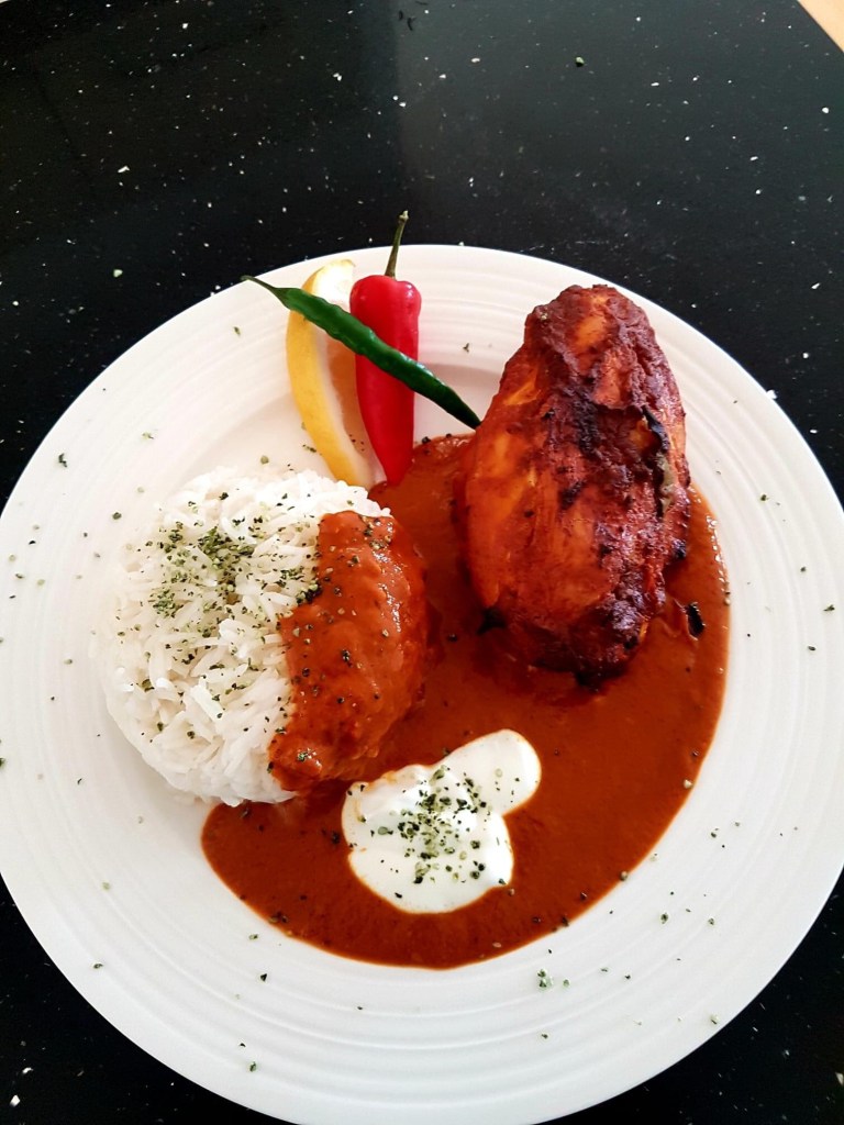 Die Soße erhitzen und Kokosmilch ,Orangensaft und Ananassaft und den anderen El Garam Masala hinzugeben. Sobald es zu kochen beginnt, Herd abschalten und über das Hähnchen geben.