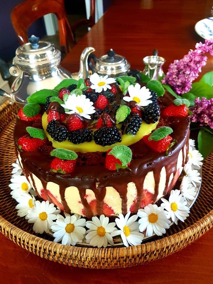 Die Schokolade nun mit der Sahne erwärmen, die Masse in einen Spritzbeutel geben und vorsichtig den Rand der Torte damit verzieren. Nach Lust uns Laune dekorieren noch mal für 1 Stunde in den Kühlschrank.