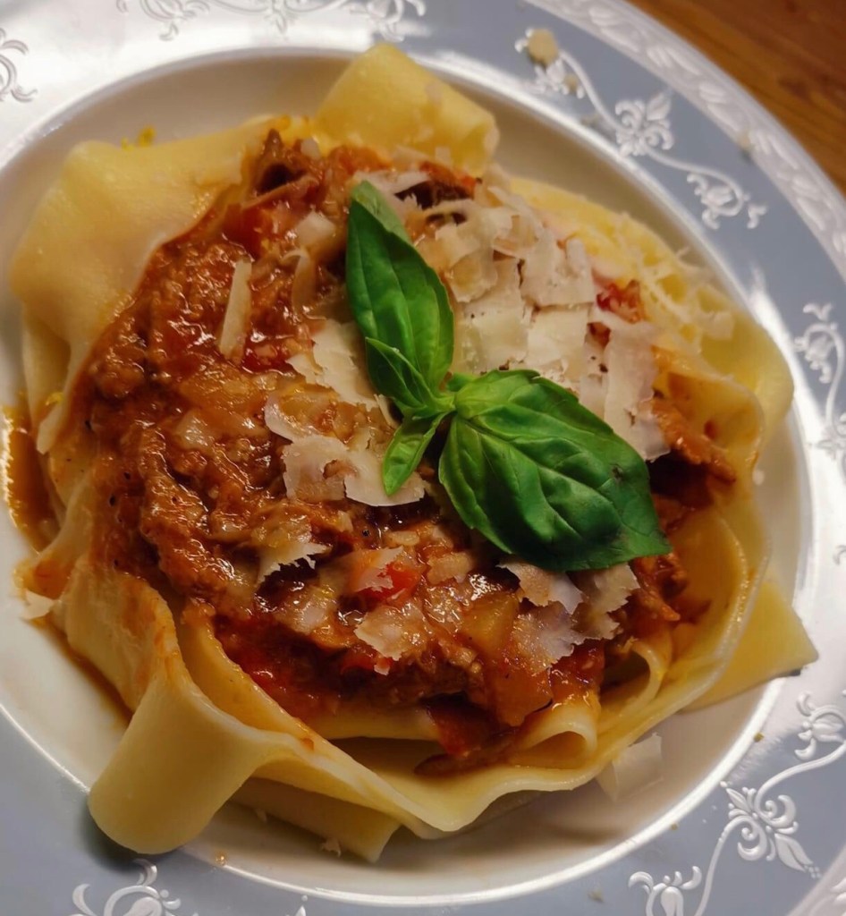 Nudeln nach Packungsangaben al dente kochen. Nudeln auf einem Teller mit dem Ragù anrichten. Etwas Zitronenabrieb und Parmesan darüber geben.