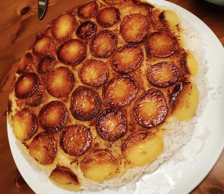 Den Pfannenboden kurz in kaltes Wasser tauchen. Dadurch löst sich die Kruste vom Boden. Dann einen großen Teller oder eine Platte auf die Pfanne legen und die Tahdig stürzen.