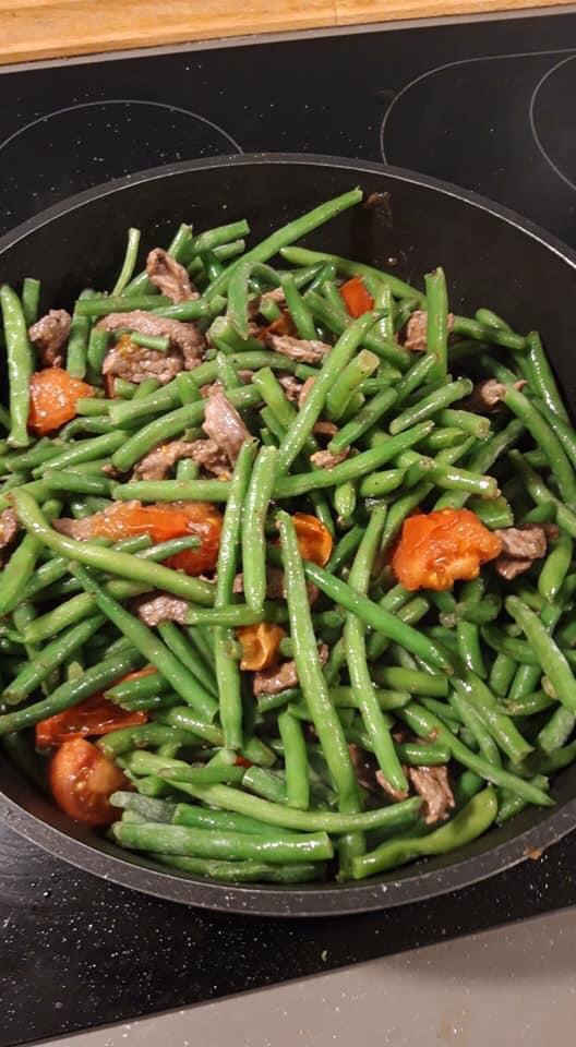 Fleisch anschmoren, Tomaten und Bohnen dazugeben. Danach Salz und Pfeffer beigeben. Eventuell mit einem Schuss Weißwein ablöschen.