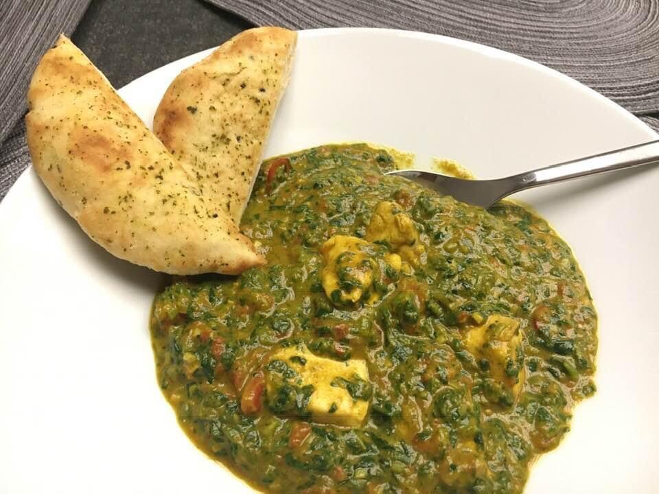 Dann den Spinat und Garam Masala zugeben und noch ein bisschen köcheln. Die Butter zugeben und servieren.