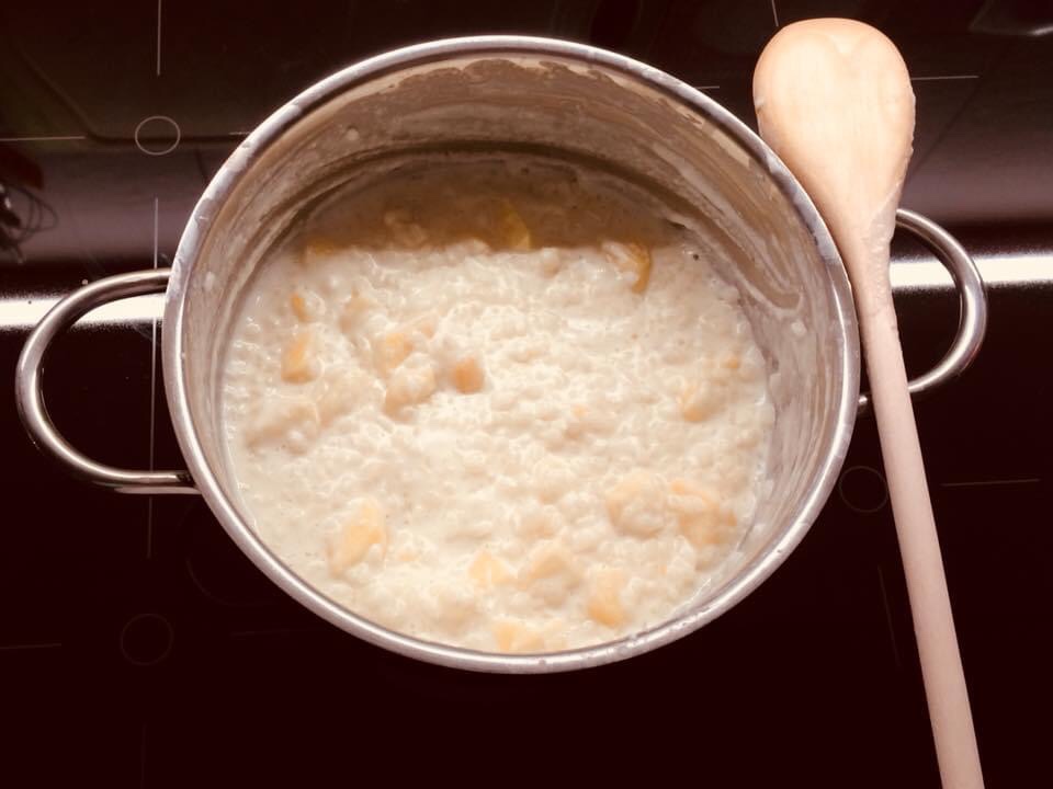 Milchreis mit Milch zum Kochen bringen, (aufpassen der setzt sehr gerne sehr schnell an) und vom Herd nehmen. Äpfel schälen, entkernen und in Stücke schneiden und dazu geben. Ca. 20 min ziehen lassen.