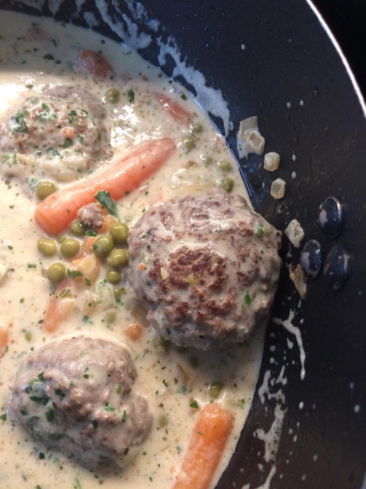 Dann die abgetropften Möhren mit Erbsen dazugeben und mit Brühe ablöschen. Mit Sahne und Maisstärke in Wasser angerührt die Sauce andicken.