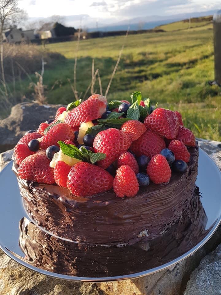 100g der Blaubeeren abwiegen und mit der Sahne vermischen. Von der Blaubeersahne jetzt 300g abmessen und das bei 30 Grad warmstellen, dann wieder 100 g der Blaubeeren in die Sahne rein und wieder 300g von der Masse abwiegen und bei 30 Grad warmstellen. Das Ganze insgesamt 5 Mal wiederholen, so dass fünf unterschiedlich eingefärbte Blaubeersahnen entstehen, die von dunkel auf hell auf den abgekühlten Boden gegossen werden mit jeweils 20 minuten Gelierpausen dazwischen( die Torte wird immer in die Tiefkühltruhe gestellt dann geliert die Masse schneller) . Die Torte mit einer Schokoladen Ganache überziehen und mit Früchten garnieren guten Appetit