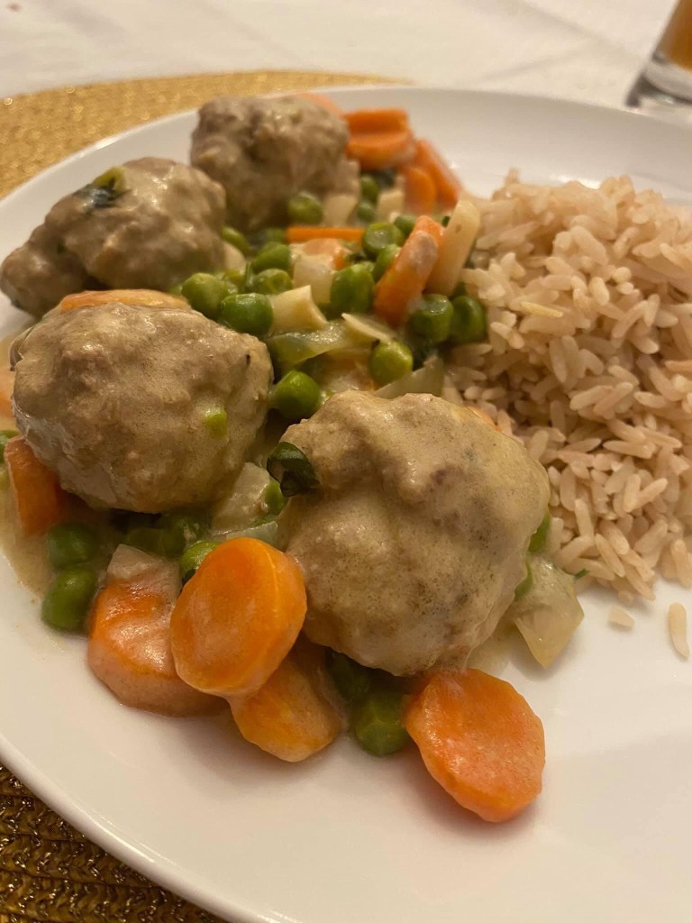 Die Hackbällchen in die Pfanne geben und mit Olivenöl anbraten, Möhren hinzufügen und langsam mitbraten. Übriges Gemüse hinzufügen und Brühe und später auch die Sahne beigeben. Mit Senf abschmecken und die gehackte Petersile drüberstreuen. Mit Saucenbinder andicken und während der Kochzeit des Reis köcheln lassen.