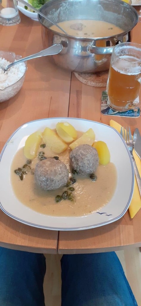 Das Hack würzen, Majoran ist dabei ganz wichtig, Zwiebel klein hacken und das ganze mit 3 Eiern und dem Paniermehl kräftig mischen. Daraus hab ich dann 12 Klopse geformt. Parallel dazu setzt Du in einem großen Topf Fleischbrühe, mit Zwiebeln, Lorbeer, Wachholderbeeren, Pfeffer und Majoran an. Das ganze aufkochen lassen, etwas herunterstellen und die Klopse ca. 20 Minuten darin ziehen lassen. (Wichtig ist, dass das nicht mehr kocht, sonst zerfallen die Klopse). Die Klopse heraus nehmen und die Brühe durch ein Sieb gießen. Dann wird eine Mehlschwitze vorbereitet und mit der durchgesiebten Brühe aufgegossen. Ein bisschen „Bütterken“ gehört natürlich dazu. Die Sahne dann mit 2 Eiern verquirlen und langsam in die kochende Soße einrühren. Mit etwas Zitronensaft, braunem Rohrzucker und den Kapern abschmecken. Die Klopse wieder reinpacken, die sollen ja auch schön heiß werden.