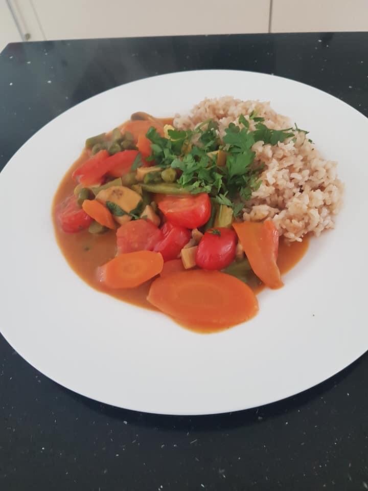 Die Möhren in Scheiben schneiden und für 5 Minuten in Öl anschwitzen. Erbsen und Bohnen hinzufügen und für weitere 5 Minuten anschwitzen. Dann Kokosmilch und Currypaste beigeben und die weiteren Zutaten der Masse beifügen. Zum Schluss die Cherrytomaten.