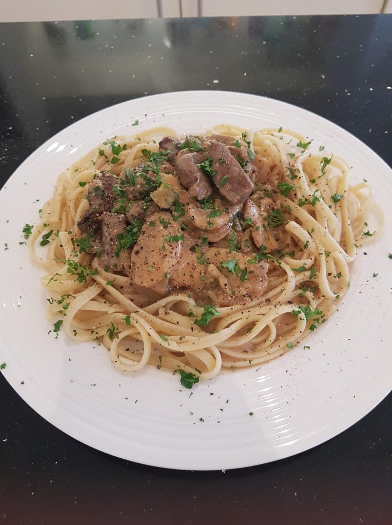 Jetzt in einem Topf Butter und ein Esslöffel Mehl anschwitzen und etwas braun werden lassen sämtliche Flüssigkeiten hinein gießen und und würzen , ca 20 Minuten einköcheln lassen, die gebratenen Champignon und Zwiebeln dazugeben und 5 Minuten köcheln lassen als letztes das Fleisch hinzugeben und bei geschlossenen Deckel nur noch ziehen lassen nicht mehr kochen sonst wird das Fleisch zäh. Um Zeit zu sparen kann man das natürlich auch alles parallel zueinander machen. Nudeln wie gewohnt kochen , anrichten und mit Petersilie bestreuen.
