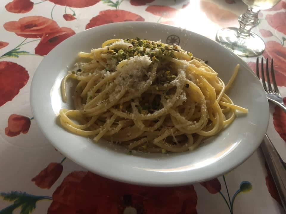 Pistazien Kerne anrösten und abkühlen lassen, dann zusammen mit den übrigen Zutaten (außer den Spaghetti) in einen Mixer geben und zu einer cremigen Masse verarbeiten.