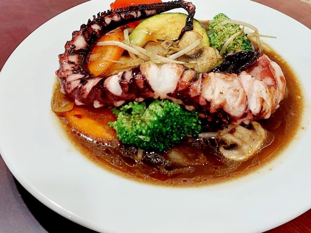 Oktopus mit 1 Weinkorken in 2 Liter Wasser, mit Wacholderbeeren, Lorbeerblätter, Pfefferkörner, Thymian, Salz, Sellerie und Zitrone zum Kochen bringen, 20 Minuten köcheln lassen und dann vom Herd nehmen und bei geschlossenem Deckel abkühlen lassen. Den Oktopus in Stücke schneiden und noch mal mit Salz und Zitronensaft würzen, dann auf den Grill legen . Das Gemüse einfach im Wok mit Brühe garen und mit Sojasauce abschmecken.