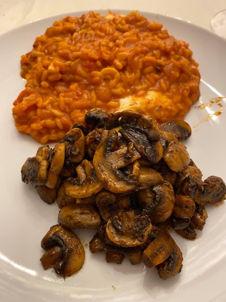 Olivenöl in einer Pfanne erhitzen, Pilze braten, zum Ende hin die Hälfte des Knoblauchs hinzufügen, das Tomatenmark hinzufügen, salzen und pfeffern und ein Drittel des Zitronensafts über die Pilze träufeln. Pfanne zur Seite stellen.