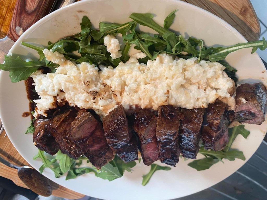 Rucola auf Teller anrichten, leicht mit Olivenöl beträufeln, Püree auf den Rucola geben und das Rumpsteak auf den Püree legen. Mit dem Fleischsaft und dem Aceto aus der Pfanne begießen. — mit Thorsten Terfort hier: Casa Altho.