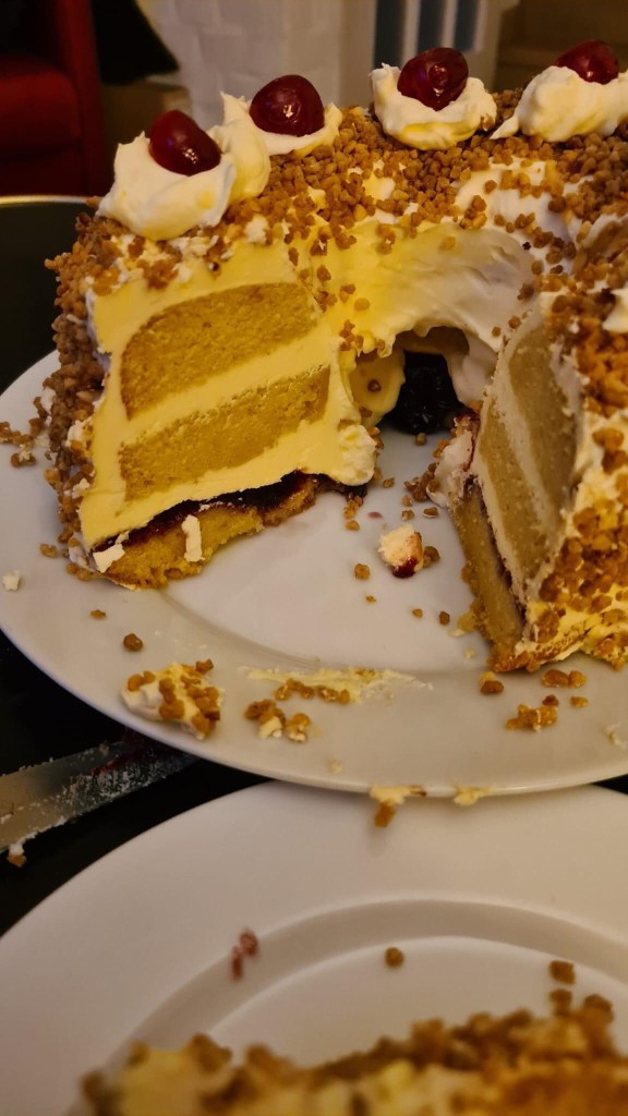 Den Kuchen dreimal durchschneiden. Jede Schicht dünn mit Marmelade bestreichen und dann mit jeweils 1/4 der Creme. Schichten aufeinandersetzen und dann die übrige Creme über den Kuchen verstreichen. Mit Krokant besetzen, Cremehäubchen spritzen und mit den Belegkirschen dekorieren.