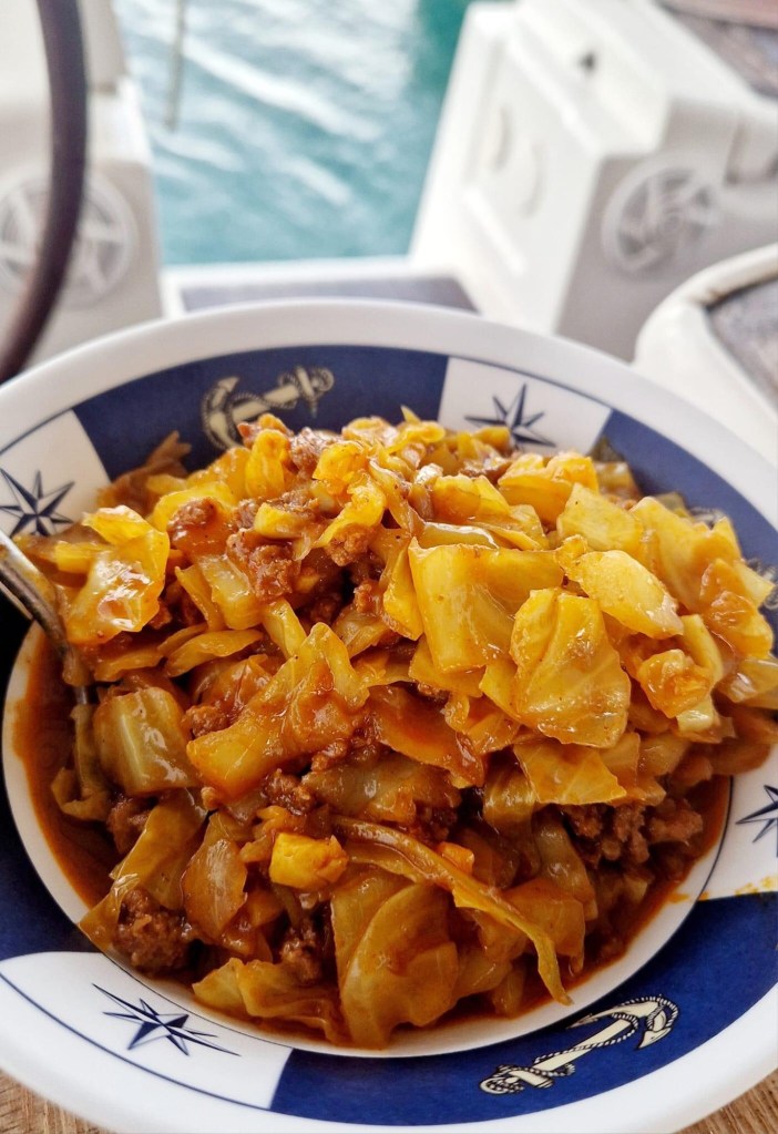 Das Gehacktes mit den Gewürzen in der Pfanne anbraten, den halben Weißkohl, klein geschnitten, mit anbraten und mit 500 ml Brühe aufgießen, bei geschlossenen Deckel 20 Minuten köcheln lassen. Schmecken lassen.