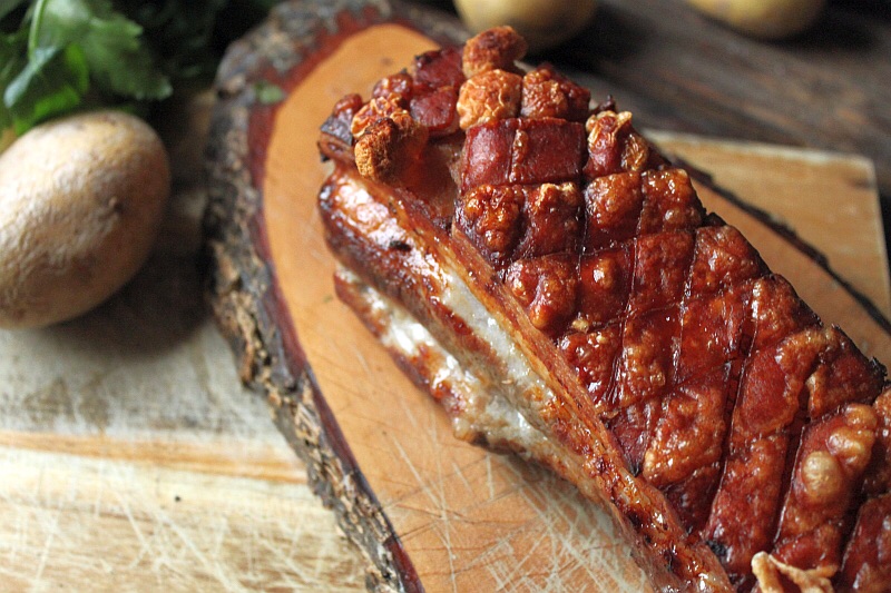 Den Ofen auf 130 Grad aufgeheizten. Gemüsebrühe in einen Bräter geben und den Schweinebauch mit der Schwarte nach unten hineinlegen. Für eine Stunde wanderte der Bräter mit dem Schweinderl jetzt in die Röhre.
