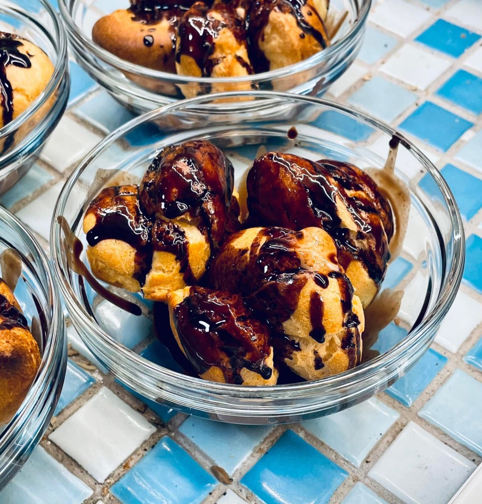 Teig in einen Spritzbeutel mit Lochtülle (ca. 12 mm) füllen und mit Abstand kleine Tuffs auf das Backpapier spritzen. Im vorgeheizten Ofen ca. 25 Minuten backen. Profiteroles auskühlen lassen.