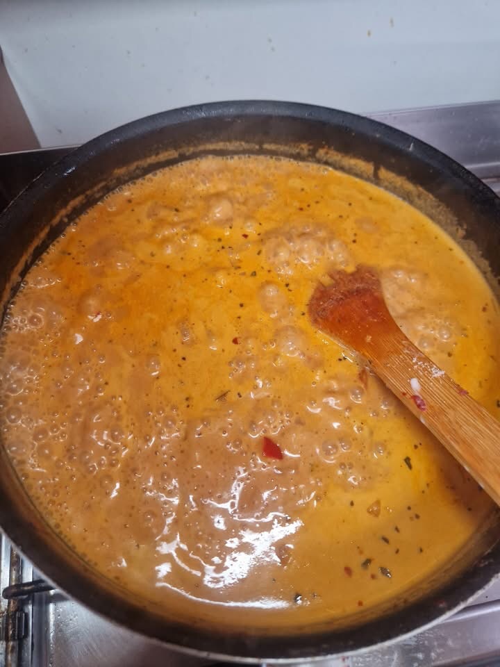 Die Bifteki habe ich gerade angebraten und sind jetzt im Backofen, in der Pfanne habe ich jetzt die Metaxasauce, die muss nachher nur noch püriert werden.