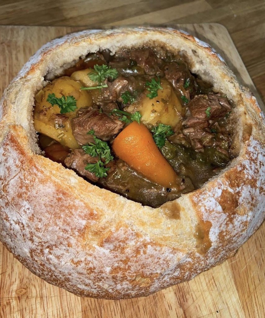 Jede Brotschale mit Rindfleischeintopf füllen und heiß servieren, mit den gerösteten Brotdeckeln servieren.