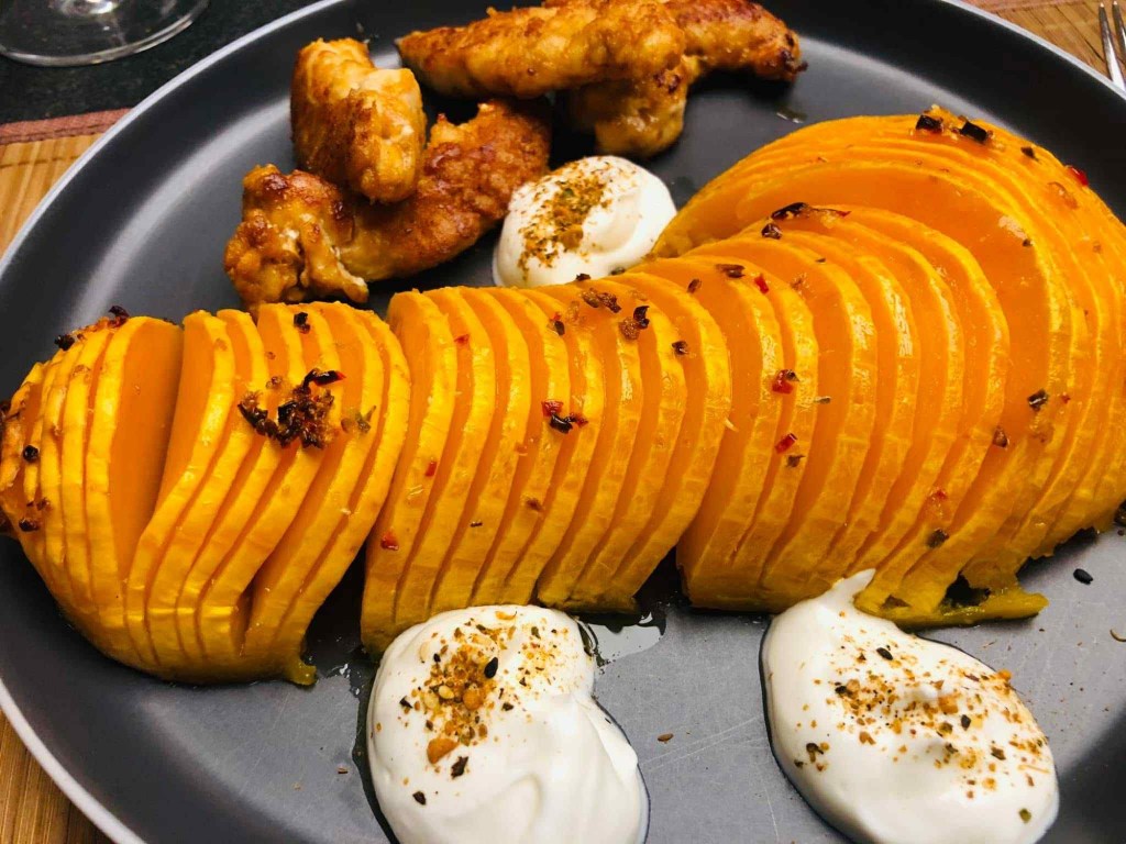 Zubereitung 1. Kürbis vorbereiten: • Kürbis schälen, halbieren, Kerne entfernen. • Die Hälften mit der Schnittseite nach unten auf ein Brett legen und im Abstand von 2–3 mm einschneiden, dabei unten nicht ganz durchschneiden (Tipp: Holzstäbchen rechts und links daneben legen, so bleibt ein „Stopper“). • Mit Olivenöl bepinseln, Knoblauch, Chili, Salz und Pfeffer darüberstreuen. • Auf ein Backblech setzen und bei 200 °C Ober-/Unterhitze ca. 35–40 Minuten backen, bis er weich und leicht knusprig ist. 2. Hähnchen knusprig braten: • Hähnchenbrust in Streifen schneiden. • In Mehl wenden, durch verquirltes Ei ziehen und in Paniermehl/Panko mit Paprika, Salz und Pfeffer wälzen. • In einer Pfanne in etwas Öl goldbraun braten (ca. 2–3 Min. pro Seite). 3. Dip anrühren: • Joghurt mit Zitronensaft, Salz und Pfeffer glatt rühren. • Mit Ras el Hanout oder Dukkah bestreuen. 4. Anrichten: • Hasselback-Kürbis auf Teller legen, Hähnchenstreifen daneben platzieren. • Mit Joghurt-Dip servieren und nach Belieben mit Chili oder Kräutern garnieren.