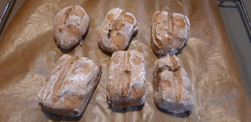 Nochmal gut per Hand durchkneten, Brotlaib formen, bisschen Mehl drauf streuen und einschneiden.