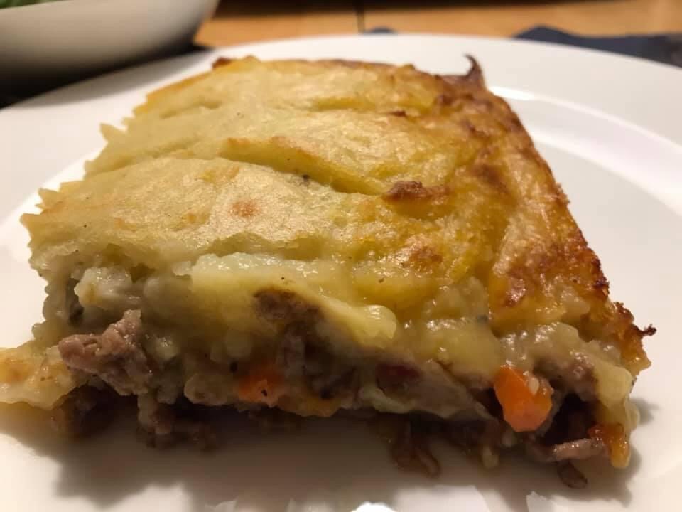 Das Püree auf dem Fleisch verteilen, sodass dieses komplett bedeckt ist. Mit einer Gabel ein Muster