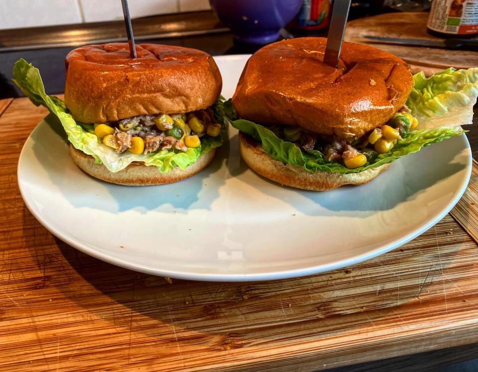 Nun die Brötchenhälften mit Mayonaise bestreichen, je ein Salatblatt pro Brötchen auflegen, mit der Thunfischcreme bestreichen und die 2. Hälfte des Brötchens auflegen.
