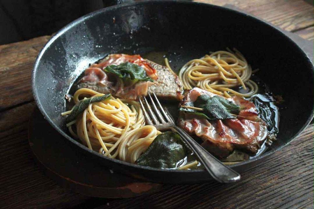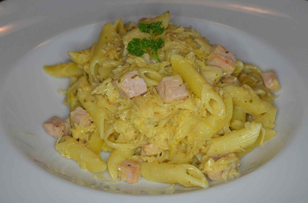 Kasslerwürfel und Nudeln in die Pfanne geben, alles gut durchschwenken. Falls es zu trocken wirkt, etwas Nudelwasser dazugeben.