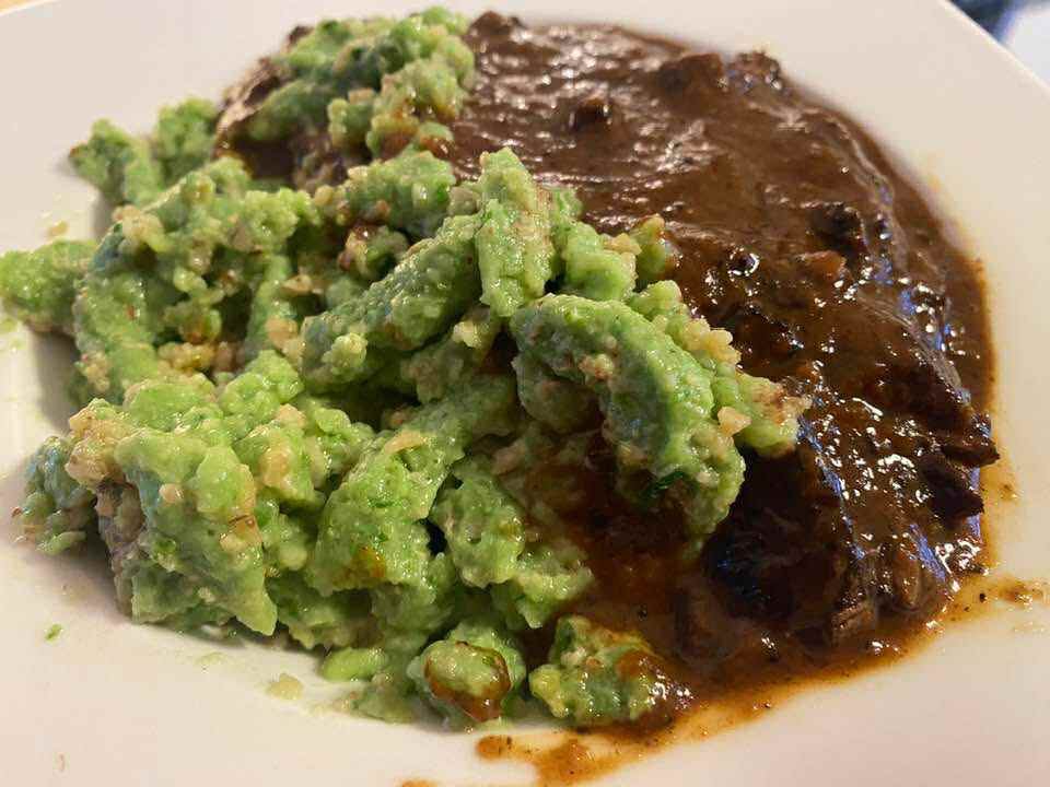 Für die Sauce die Zwiebeln in Olivenöl glasig braten und mit etwas Balsamico ablöschen, Knoblauch und den Basilikum hinzufügen und alles mit Passata und Wasser ablöschen.