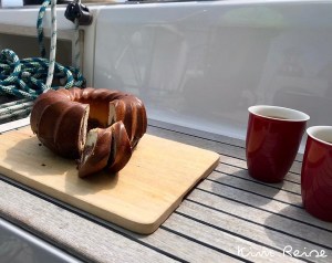 Und nun zu den Schichten: es wurde eine 26er Form rund verwendet, der Boden mit Backpapier ausgelegt. Pro Schicht wird eine kleine Suppenkelle Teig verwendet, der Teig wird mit einem Pinsel verteilt. Jede Schicht wird 4 – 6 Minuten gebacken bis sie eine spekulatiusähnliche Farbe hat. Dann wird die Kuchenform aus dem Ofen geholt und eine neue Schicht aufgetragen.