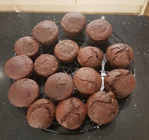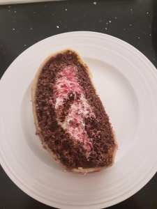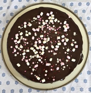 Wenn die Teigmasse aufgebraucht und verbacken wurde, muss der Kuchen am Rand freigeschnitten werden und man lässt ihn jetzt abkühlen. Der Kuchen sackt in der Höhe etwas zusammen. Mit geschmolzener Schokolade (2 Teile herb, 1 Teil Vollmilch) überziehen.