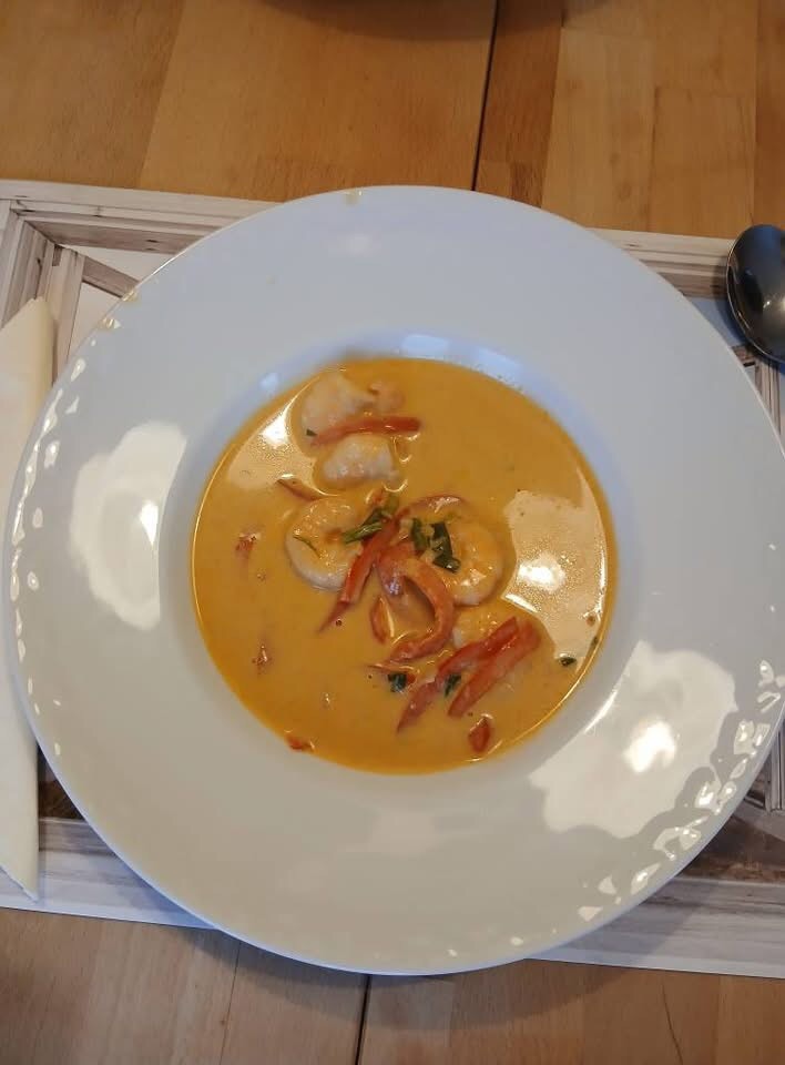 • Die Nordseekrabben kurz in der heißen, aber nicht mehr kochenden Suppe erwärmen (sonst werden sie zäh).