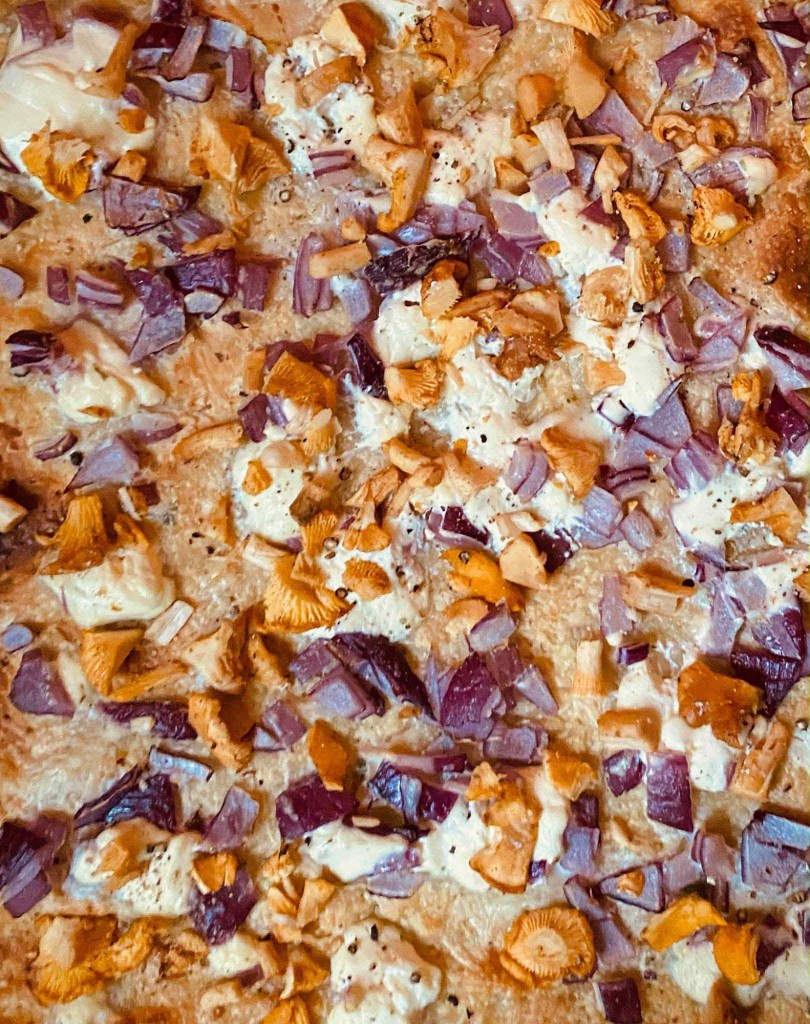 • Im vorgeheizten Ofen bei 200 °C Ober-/Unterhitze ca. 40–45 Minuten backen, bis der Belag gestockt und leicht gebräunt ist.