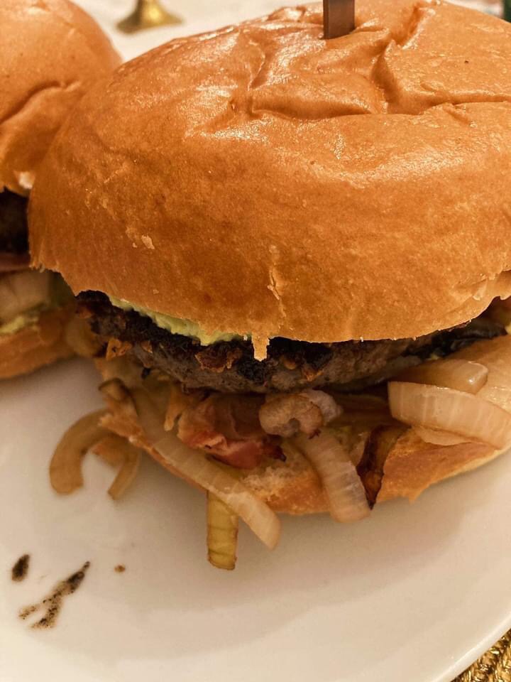 Burgerbuns in Hälften teilen, mit Avocadocreme bestreichen, mit Zwiebeln und Bacon belegen. In der Zeit die Patties braten.
