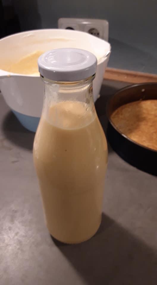6 Eier mit 150g Zucker aufschlagen, gern in der Maschine. Das Mark einer Vanilleschote und die Schale zweier Orangen dazu geben. 250 ml gesüßte Kondensmilch, den Saft der Orangen (etwa 150 ml) sowie 350 ml Weinbrand ebenfalls langsam dazu gießen.