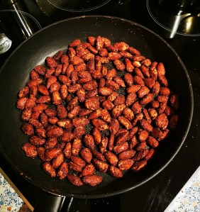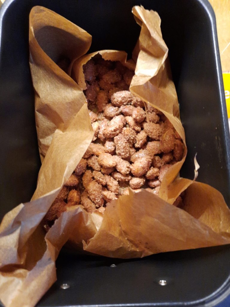Mandeln auf Backpapier in der Heißluftfritteuse verteilen.