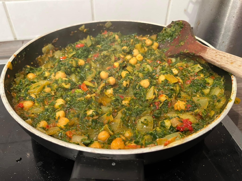 Zwiebeln und Knoblauch würfeln und anbraten. Kichererbsen in die Pfanne geben, die Gewürze hinzufügen, mit den Tomaten ablöschen und den aufgetauten Grünkohl dazugeben.