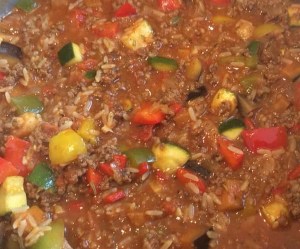 Nun den Reis und die Gemüsebrühe hinzufügen, ordentlich Oregano und Rosmarin dazu, noch mal mit Pfeffer und Salz würzen und ca. 20 Minuten kochen lassen bis der Reis gar ist.